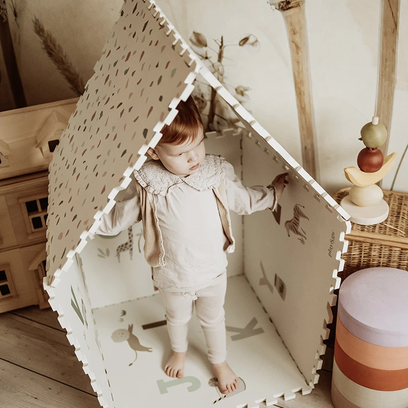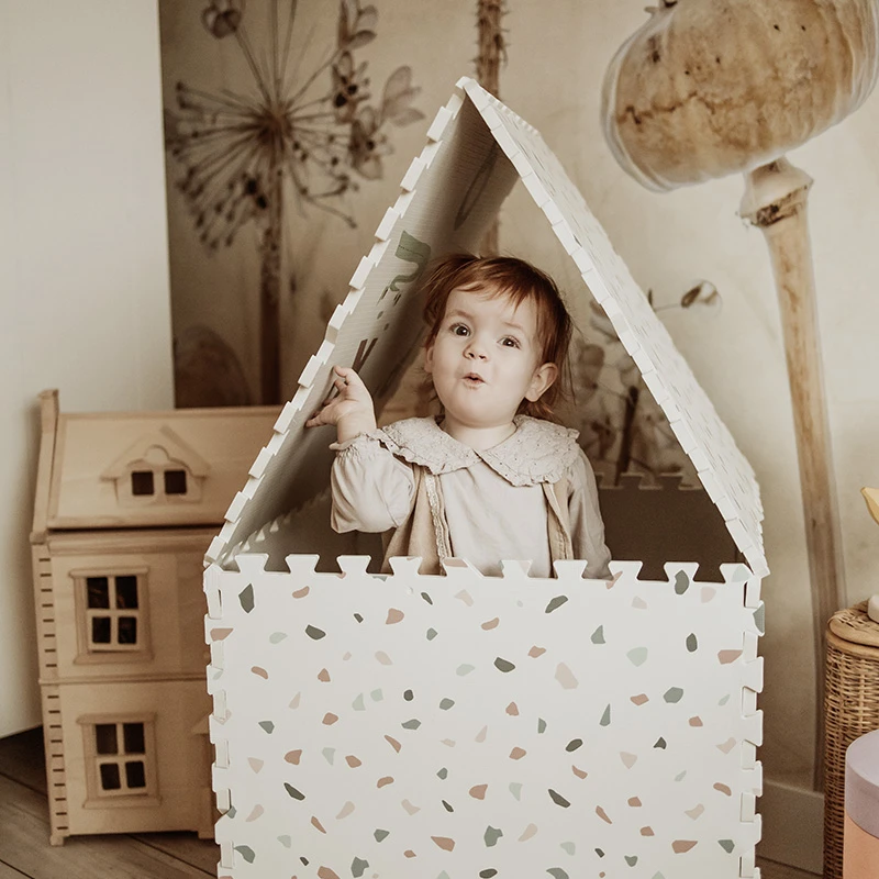 • die Puzzlestücke können zu einer Spielmatte oder einem Spielhaus zusammengebaut werden