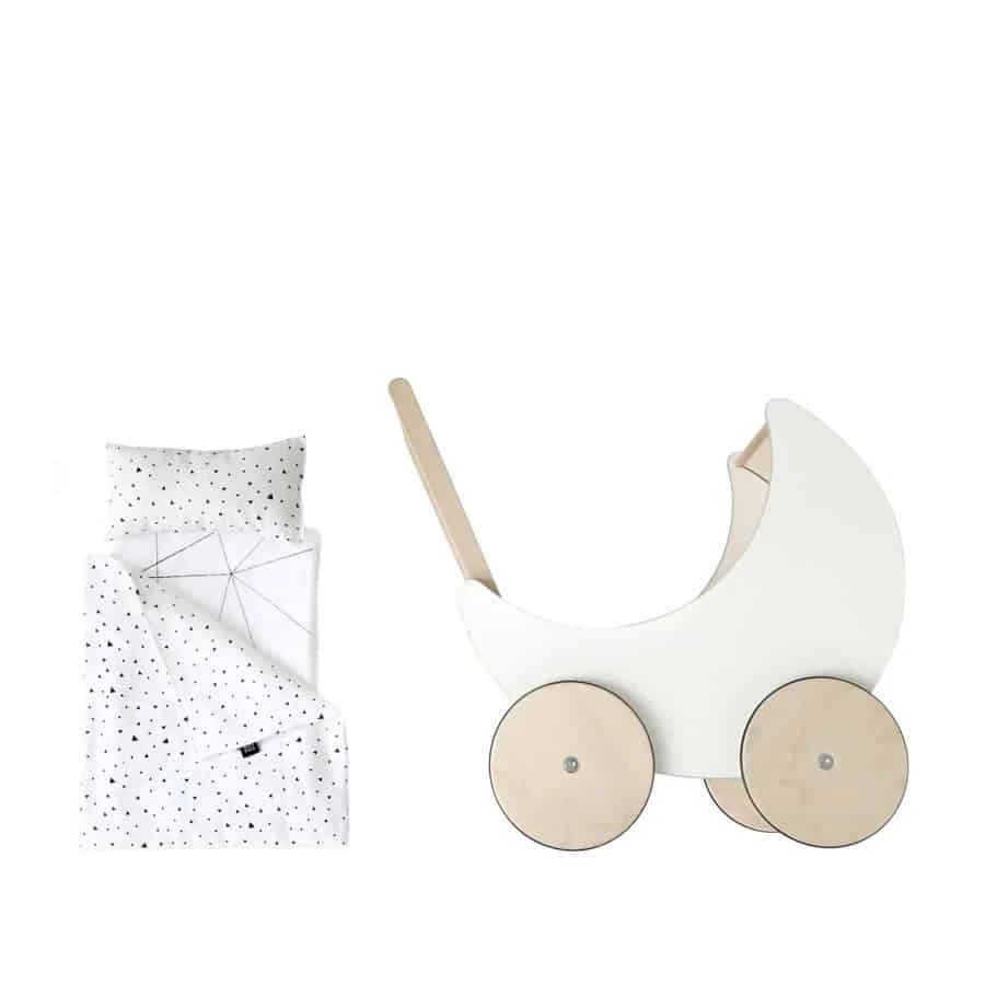 Damit es alle „Fahrgäste“ im Holz-Puppenwagen von ooh noo auch schön kuschelig haben, ist dieser Satz frischer Bettwäsche optimal geeignet. Die zusammenpassende Decke und das Kissen bestechen zudem mit ihrem hübschen Muster – in diesem Fall den kleinen, bunten Dreiecken auf elegantem weiß. Eine Unterlage ist im Lieferumfang enthalten.