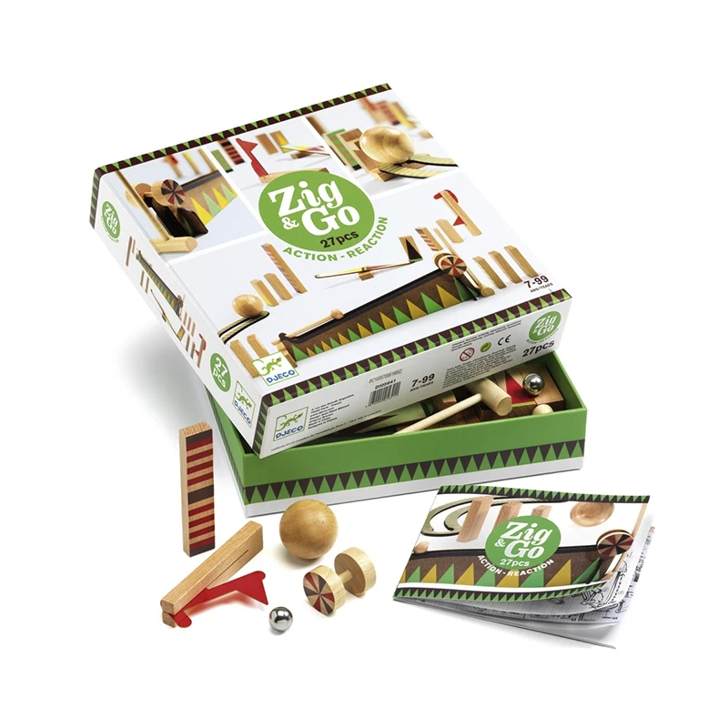 „Zig & Go“ von DJECO steht für ein spaßiges Aktion-Reaktion-Spieleerlebnis. Der Baukasten ermöglicht es, einen Parcours nach einer der mitgelieferten Vorlagen zu bauen oder auch ein ganz eigenes Modell zu entwerfen. Es gibt viele Möglichkeiten, die Bauteile zu platzieren und am Ende eine riesige Kettenreaktion auszulösen. Dabei ist Geschicklichkeit gefragt. Noch raffinierter wird der Parcours, wenn man ihn mit Bestandteilen anderer „Zig & Go“-Baukästen der Kollektion kombiniert.
