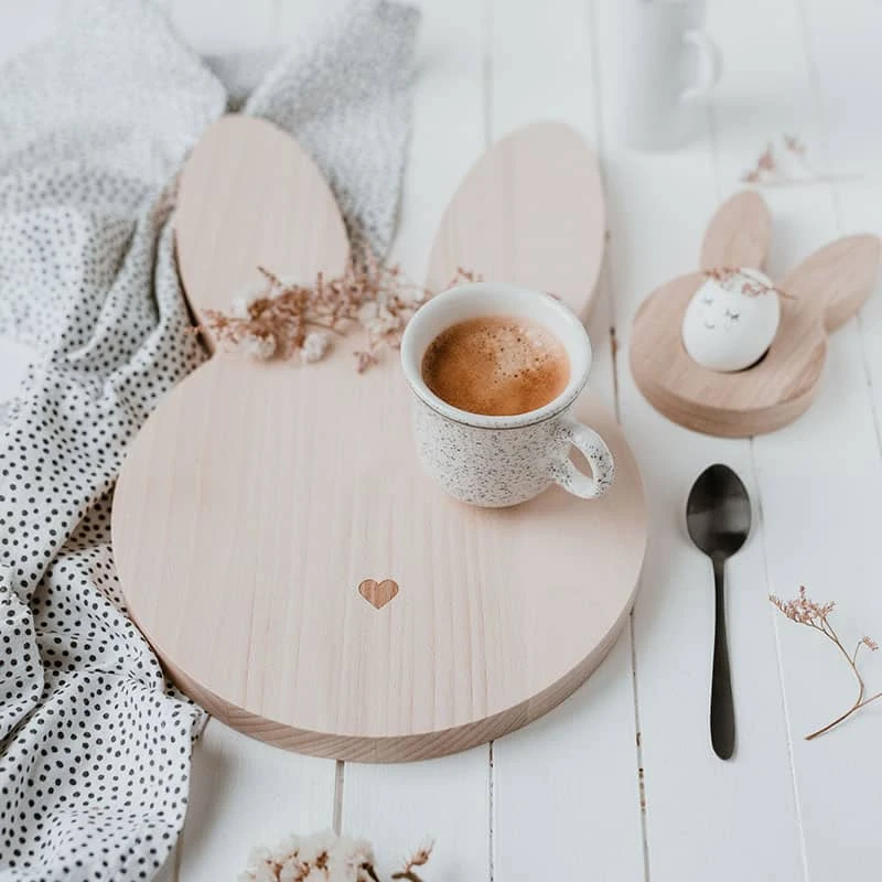 Die kleinen Eierbecher aus Massivholz von Eulenschnitt tragen zu einer besonders liebevollen Gestaltung des Frühstückstischs bei. Durch das mittige Loch im Holz hat das Ei einen sicheren Stand, damit beim Verspeisen auch nichts schief geht. Die Häschen-Form ist vor allem an Ostern ein dekoratives Highlight.