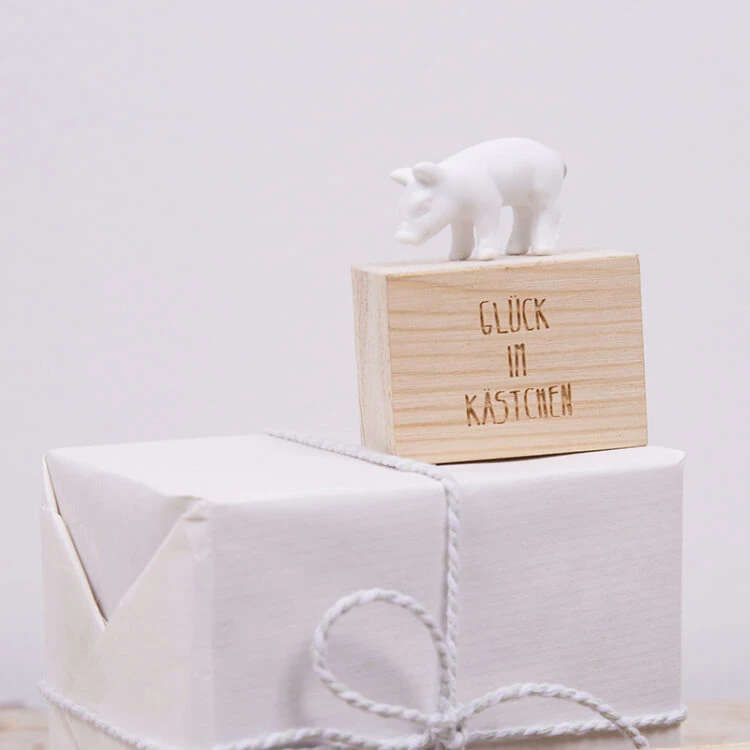 Eine designtechnisch hochwertige Geschenkidee stellt das „Glück im Kästchen“ von räder dar. In der aufklappbaren Holzschatulle mit eingelasertem Spruch befindet sich eine Porzellanfigur – in diesem Fall ein süßes Glücksschweinchen.