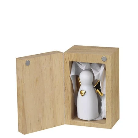 Eine designtechnisch hochwertige Geschenkidee stellt dieser Glücksengel im Holzkästchen von räder dar. In der aufklappbaren Schatulle mit eingelasertem Aufdruck befindet sich ein kleines Glücksengelchen aus Porzellan, das dem Beschenkten besonders viel Glück bringen.