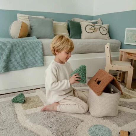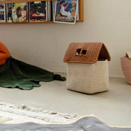 Dieses kleine Korb-Häuschen st eine ideale Ergänzung zu den Spielteppichen der „Eco City“-Kollektion von Lorena Canals. Unter dem Dach finden kleinere Spielsachen und andere Utensilien in einem geflochtenen Baumwollkörbchen Platz, um sicher verstaut zu werden. Das Dach ist dabei fest am oberen Korbrand angenäht, ist dank großzügiger Öffnungen aber dennoch leicht zugänglich.