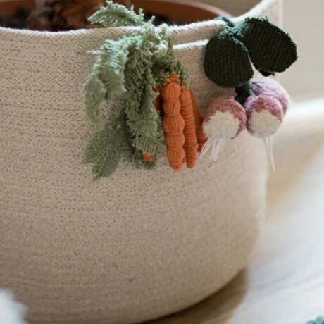 In Zusammenarbeit mit „Oli&Carol“ hat Lorena Canals eine einzigartige Kollektion erarbeitet, die für Frische in den eigenen vier Wänden sorgt. Und in der Tat: Die liebevoll handgefertigten, flauschigen Gemüse-Produkte sehen einfach zum Anbeißen aus! Dieser Baumwoll-Korb hat allerdings nicht nur eine dekorative Funktion: Er kann auch zum Organisieren von Kleinigkeiten, Wäsche oder Spielsachen genutzt werden! An einem der beiden Griffe baumelt lecker aussehende Gemüse-Dekoration.