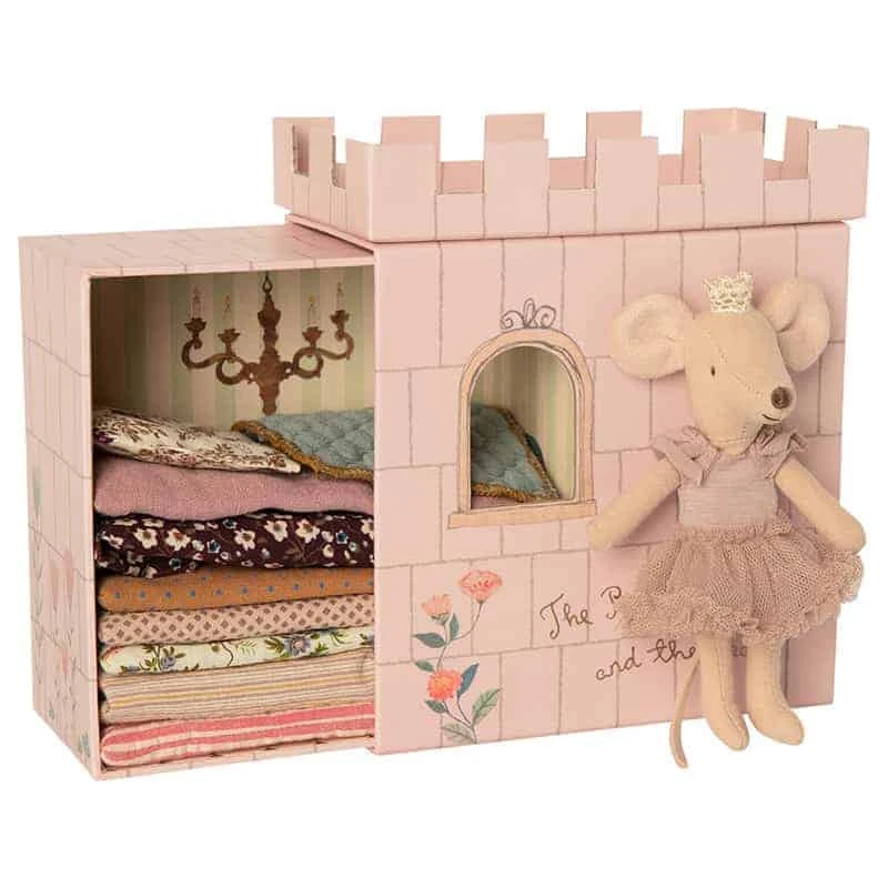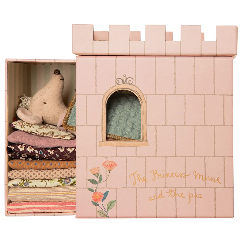 Inspiriert vom Märchen von der „Prinzessin auf der Erbse“ schläft dieses königliche Mäuschen in seinem kleinen Schloss auf mehreren gestapelten Matratzen über einer „magischen Bohne“ – und hat es dabei zauberhaft gemütlich! Maileg setzt bei der Produktion der Kuscheltiere auf eine hochwertige Baumwoll- und Leinen-Komposition. Das sorgt für ein angenehmes Gefühl beim Spielen.
