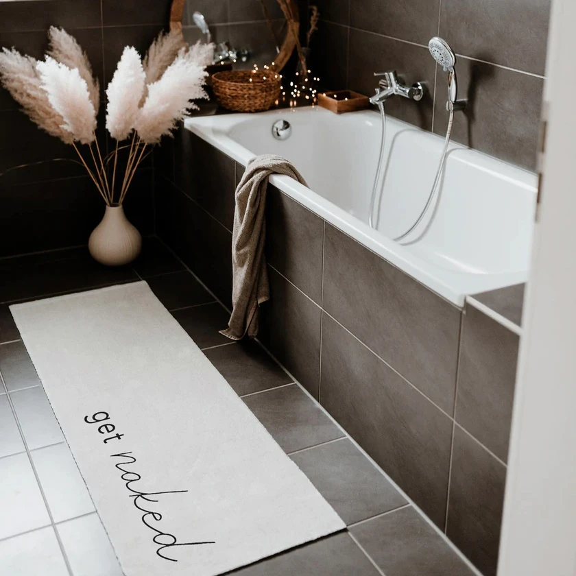 Die rutschfesten sowie besonders weichen Läufer von Eulenschnitt zaubern dank ihrer mal herzlichen, mal schelmischen Sprüche in schlicht-eleganten Designs jedem ein Lächeln ins Gesicht. Dank der verwendeten High Twist Polyamid-Fasern sind sie sowohl pflegeleicht als auch rutschfest und waschbar. Die besonders weiche Haptik sorgt für einen zusätzlichen Vorteil: Die Matte eignet sich ganz wunderbar zu Deko-Zwecken für den Innenbereich! Dieses Exemplar macht sich dank des Aufdrucks natürlich besonders gut im Badezimmer.