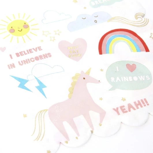 Diese Servietten werten den Tisch jeder Motto- und Geburtstagsparty auf. Und natürlich erfüllen sie auch einen praktischen Zweck: So wird beim und nach dem Speisen nichts angekleckert! Die abgerundeten Papier-Servietten sind mit vielen bunten und glitzernden Einhörnern und Regenbögen sowie Goldfoliendetails traumfhaft schön illustriert.