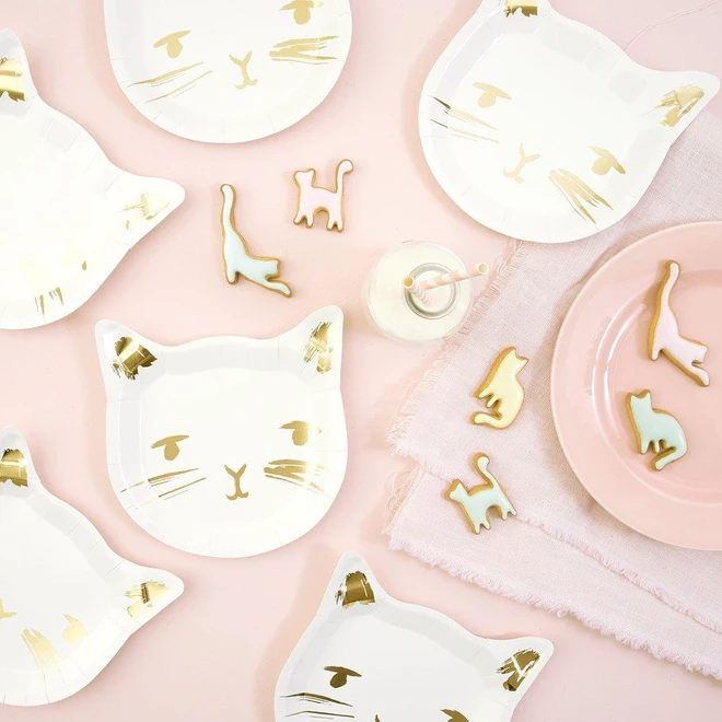 Diese süßen Pappteller werten den Tisch jeder Party mit Garantie auf und begeistern vor allem Katzenliebhaber. Die Goldfoliendetails bringen das kleine Kätzchen an Ohren, Augen und Mund zum Funkeln – stilvoll und elegant!