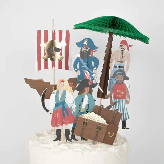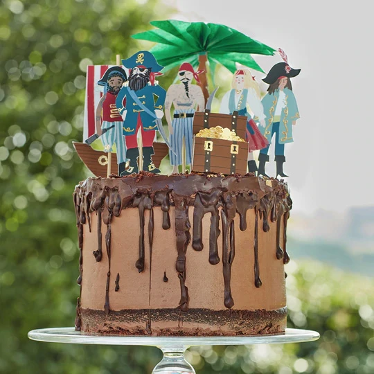 Mit dieser liebevollen Party-Verzierung von Meri Meri schmeckt der Kuchen gleich noch besser – und sieht vor allem viel gefährlicher aus! Der Themen-Topper wartet mit der hübschen Illustration einer Piraten-Crew und einer Palme auf und lässt sich einfach auf einem großen Kuchen platzieren.