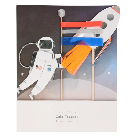 Mit dieser liebevollen Party-Verzierung von Meri Meri schmeckt der Kuchen gleich noch besser – und sieht vor allem viel futuristischer aus! Die Themen-Topper warten mit hübschen Illustration eines Astronauten mit einer Fahne sowie einer Rakete auf, um die Mondlandung auf dem Geburtstagskuchen astrein nachspielen zu können. Die Bambus-Spieße lassen sich kinderleicht auf jedem Kuchen platzieren.