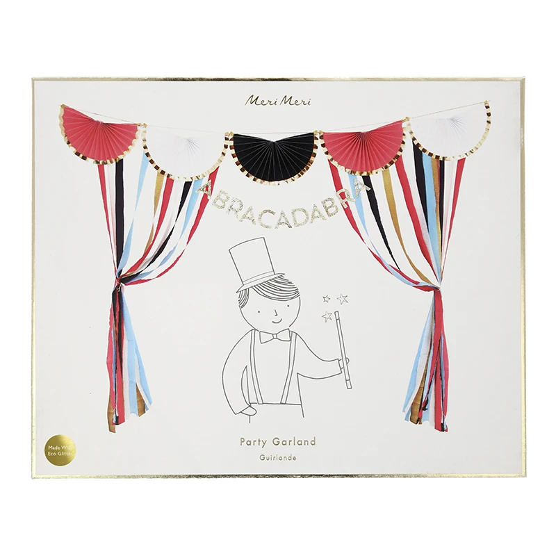 Damit die Zaubershow endlich losgehen kann, braucht es einen passenden Vorhang. So können sich die kleinen Zauberlehrlinge ganz wie die großen Magier auf den Bühnen fühlen. Die Vorhang-Girlande besteht aus drei Teilen, damit Schrift, Fransen und Fächer so angeordnet werden können, wie man sich die perfekte Bühne vorstellt.