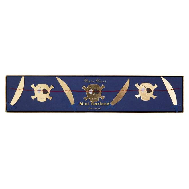Diese dekorative Mini-Girlande von Meri Meri darf auf der nächsten Piraten-Mottoparty nicht fehlen: Sie enthält gold schimmernde Piraten-Symbole wie Schwerter, Totenköpfe und gekreuzte Knochen. Damit ist die nächste Freibeuter-Feier gerettet!
