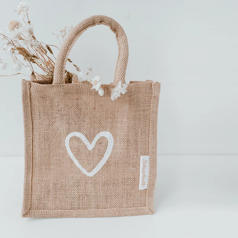 Hochwertige Geschenk-Tüten im Zweier-Set von Eulenschnitt: Wer kleinere Präsente nachhaltig verpacken möchte, bekommt mit diesen Mini-Jutetaschen eine hübsche Alternative. Das dekorative Herzchen auf der Vorderseite ist der besondere Hingucker des Naturprodukts.