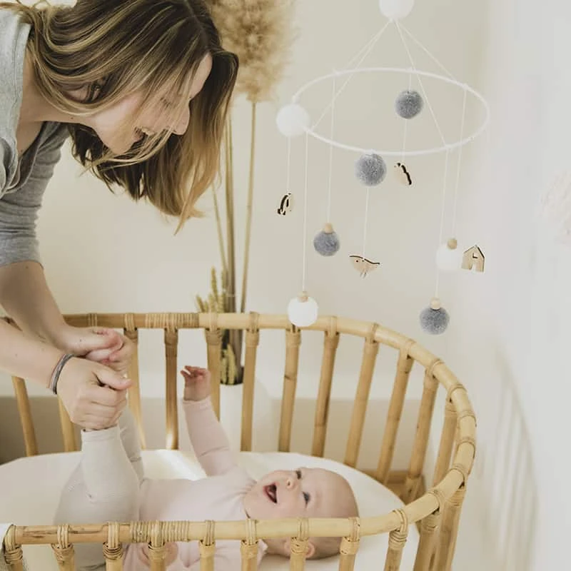 Der letzte Blick vor dem Einschlafen ist meist Richtung Decke gerichtet. Damit der Ausblick für Kinder nicht ganz so langweilig ausfällt, eignen sich Mobiles ideal als Eyecatcher. Das Modell „Pom-Poms“ von räder ist mit einigen besonders schönen Formen wie kleinen Elefanten und Vögelchen besetzt und hochwertig verarbeitet.