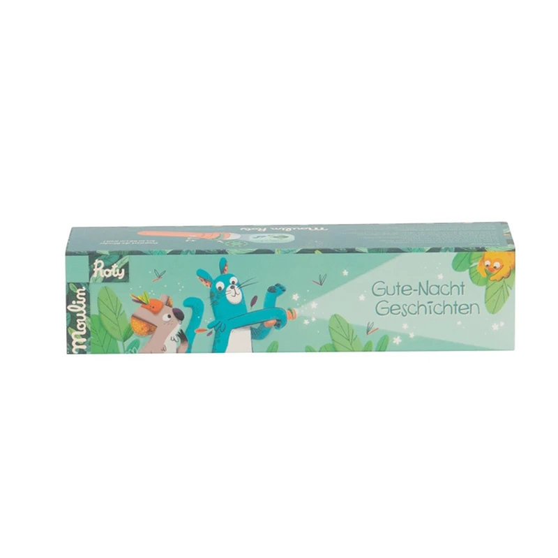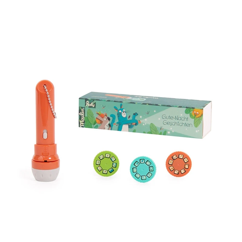 Die Projektionsleuchte von Moulin Roty beschert spannende Abende mit Geschichten inklusive schöner visueller Untermalung. In die Lampe können drei Drehscheiben mit jeweils acht unterschiedlichen Bildern eingelegt werden, die allesamt ihre eigene Bildergeschichte erzählen. Die Motive werden mithilfe der Lampe an eine große Fläche wie eine Wand projiziert. Dabei lassen die Bildergeschichten viel Spielraum für eigene Erzählungen und Ausschmückungen – und regen so auch zur Kreativität an.