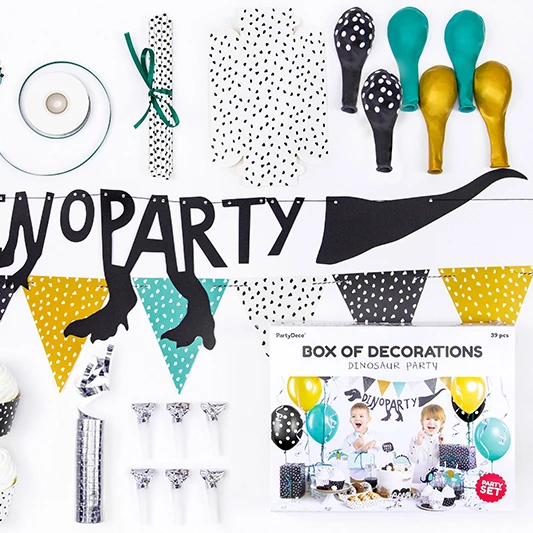 • inklusive einem Dino-Partybanner und einer Papier-Girlande