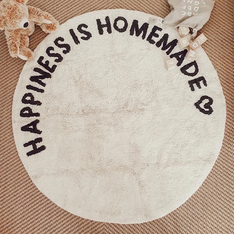 Das Rezept für häusliches Glück hat viele Zutaten. Eine davon ist, sich die eigenen vier Wände so gemütlich wie möglich zu gestalten. Dieser Baumwollteppich ist besonders weich verarbeitet und mit der Lebensweisheit „Happiness is Homemade“ getuftet, die dem Betrachter ein Lächeln auf die Lippen zaubert.