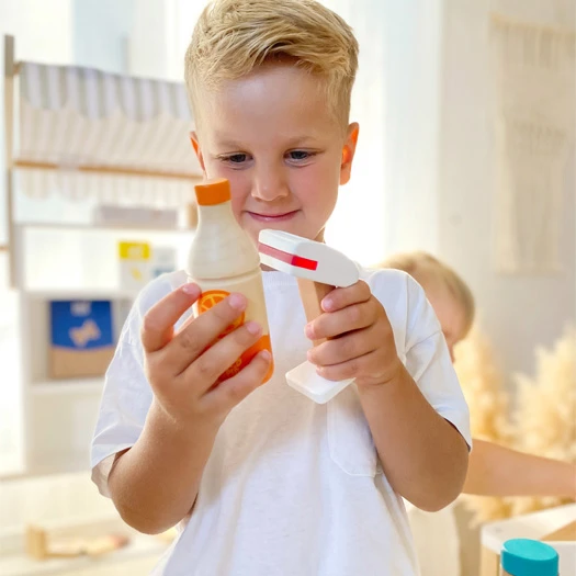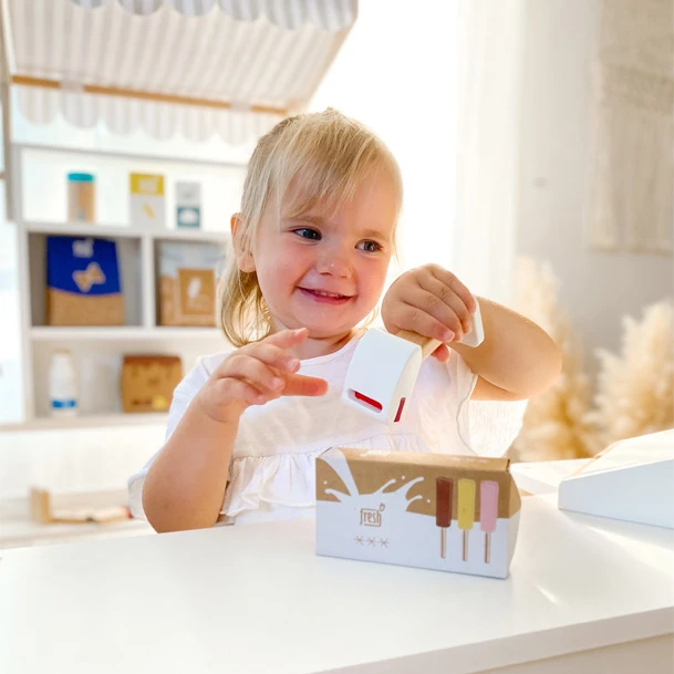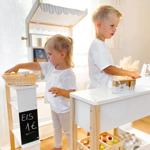Die kompakte Version des Multifunktions-Kaufladens „fresh“ von small foot überzeugt durch die Kombination aus neutralem Weiß und viel naturbelassenem Holz. So passt er besonders dezent zu jeder Wohn- oder Kinderzimmereinrichtung. Die mit Klett befestigte Stoffmarkise sorgt dabei für den typischen Kaufmannsladenlook. Artikel und Spiellebensmittel finden ausreichend Platz in den Ablagebereichen und Fächern, sodass der Verkaufsstand immer aufgeräumt wirkt. Abgerundete Beine und Kanten des vorderen Tresens erzeugen ein gefälliges Bild und sorgen für Sicherheit. Das macht den Laden zu einem Must-Have im Trend-Design, das das Rollenspielzeug- und Kaufladen-Sortiment optimal abrundet.