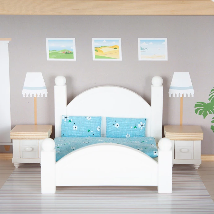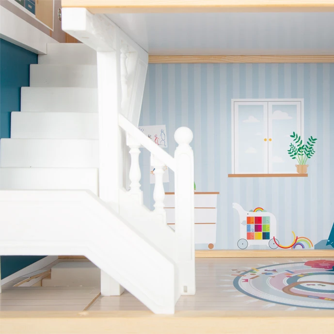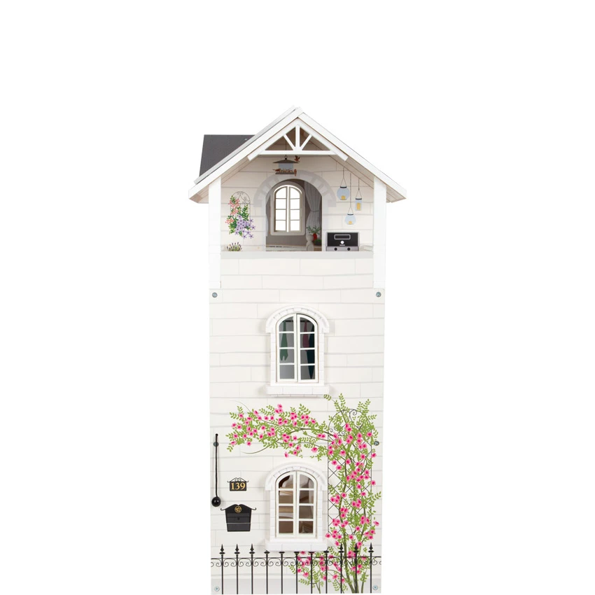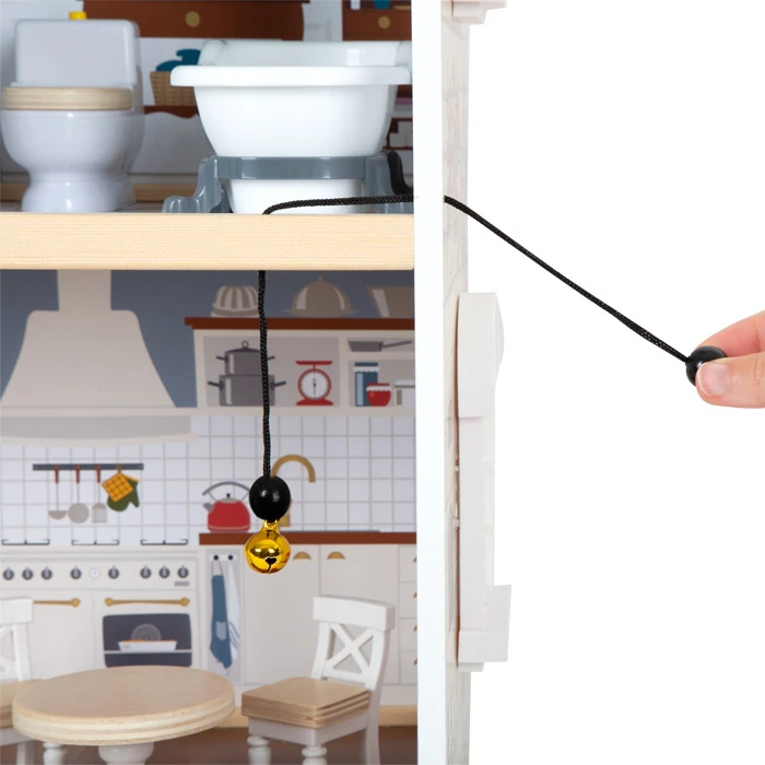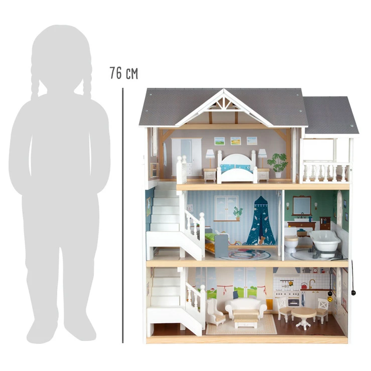 Dieses große Holz-Puppenhaus mit drei Etagen und offener Front überzeugt durch detailreiche Gestaltung und moderne Farbgebung. Wohnküche und Wohnzimmer, Kinderzimmer und Bad sowie Schlafzimmer und Loggia bieten viel Freiraum für fantasievolles Spielen. Treppen, eine Schiebetür, zu öffnende Fenster, Nachtkästchen mit Schubläden und eine echte Glocke, mit der sich Besuch ankündigt, machen zusammen mit den zwölf Möbelstücken und vielen Accessoires den Spielspaß perfekt. Die Villa fügt sich dank heller Außenfassade und moderner Farbgebung perfekt in jede Wohn- oder Kinderzimmerumgebung ein. Die offene Front erleichtert die Bespielbarkeit und ermöglicht es auch mehreren Kindern gleichzeitig, mit dem Puppenhaus zu spielen.