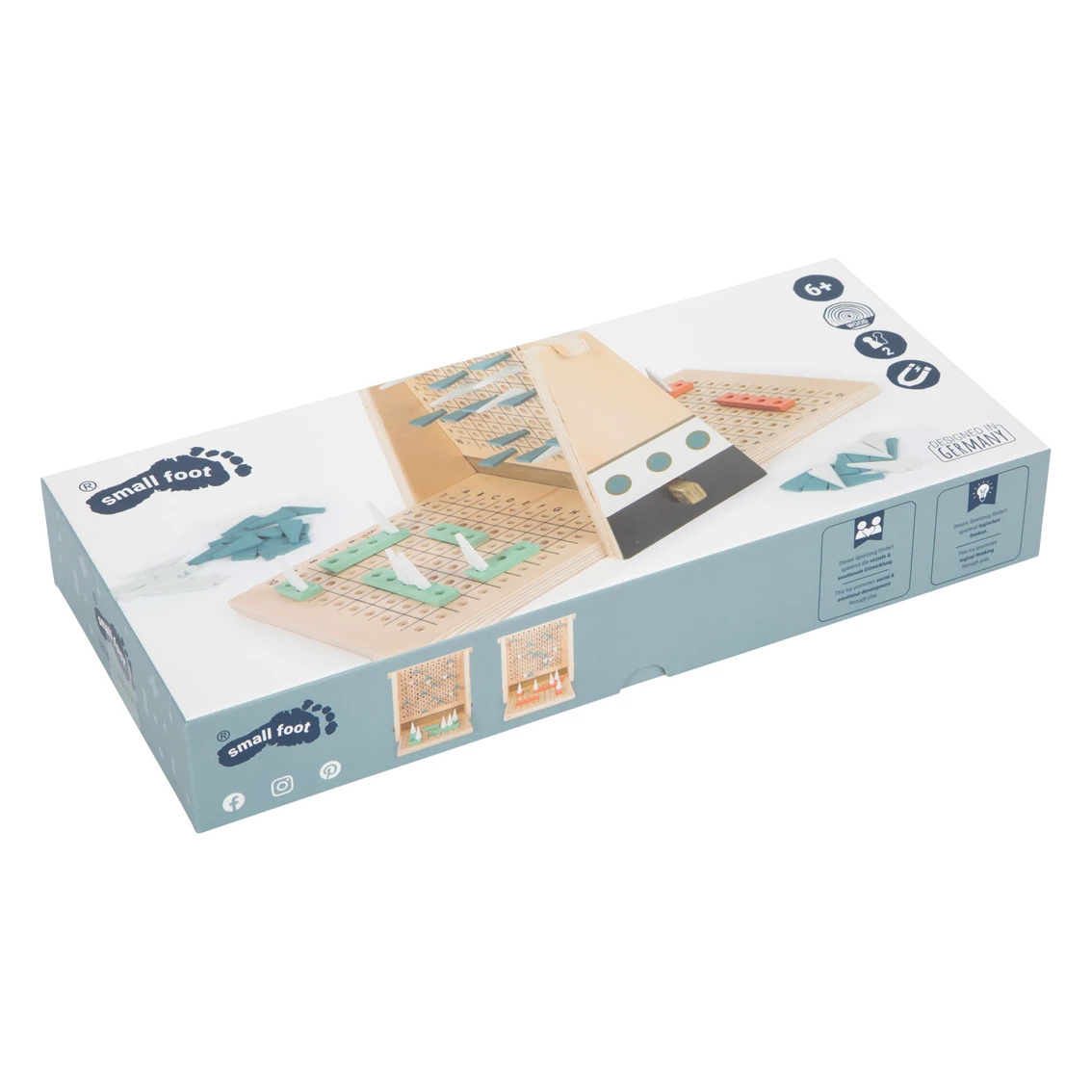 Die „Gold Edition“ des deutschen Herstellers small foot interpretiert beliebte Strategiespiele neu – wie in diesem Fall der Klassiker „Schiffe versenken“. Bei dieser Variante des Kultspiels verhindert eine Nebelwand den Blick auf das gegnerische Starterfeld. Blaue Wasserfontänen zum Stecken zeigen während des Spiels an, wenn eine Koordinate neben einem Schiff angesagt wird, weiße Segel stehen für Koordinaten, an denen sich ein Schiff befindet. Praktisch: Die Koordinatenbrettchen können einzeln in der Hand gehalten oder in den Rahmen gelegt werden. Ein kompaktes Spiel – ideal auch für unterwegs und auf Reisen.