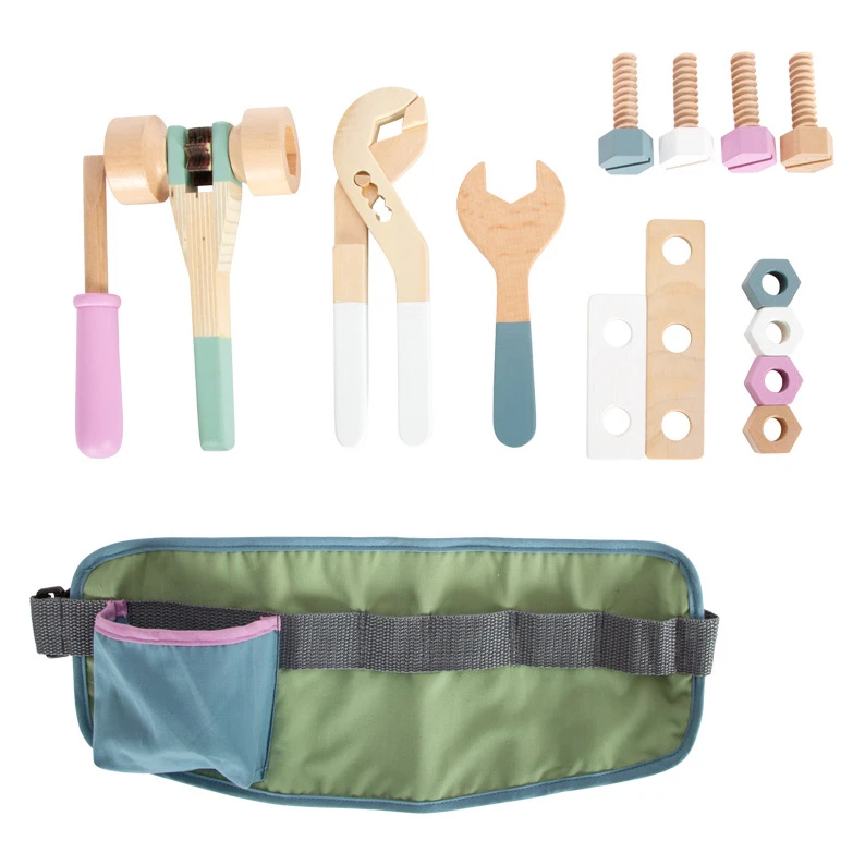 Mit diesem verstellbaren Werkzeuggürtel im skandinavischem Look mit sanften Farben haben kleine Handwerker die Hände frei und ihr Equipment doch immer griffbereit. Mit realitätsnah gestaltetem Werkzeug und Zubehör aus Schraubendreher, Maulschlüssel, Schrauben und Lochleisten aus Holz wird der nächste Handwerkseinsatz ein Kinderspiel. Besondere Highlights sind die Wasserpumpenzange sowie die Ratsche.
