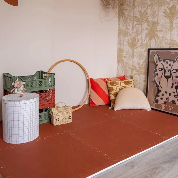 Rutschfest, weich, Allergikerfreundlich und leicht zu reinigen: Die aus hochwertigem EVA-Schaum bestehenden Spielmatten von eeveve sind ideal für das tägliche Spiel von Babys und Kleinkindern geeignet, können aber auch von Erwachsenen genutzt werden – etwa für Yoga-Übungen oder Pilates. Da sie eine dämpfende Wirkung haben, sind sie auch sehr gut unter einer Schaukel, einem Spielring oder einer Rutsche verwendbar. Jede der Matten besteht aus mehreren Fliesen, die im Stil eines Puzzles miteinander kombiniert werden können, ohne dass sichtbare Übergänge entstehen. Das sorgt gleichzeitig dafür, dass sich mehrere Spielmatten – auch in anderen Farbtönen und Mustern – zu einer großen zusammenfügen lassen.
