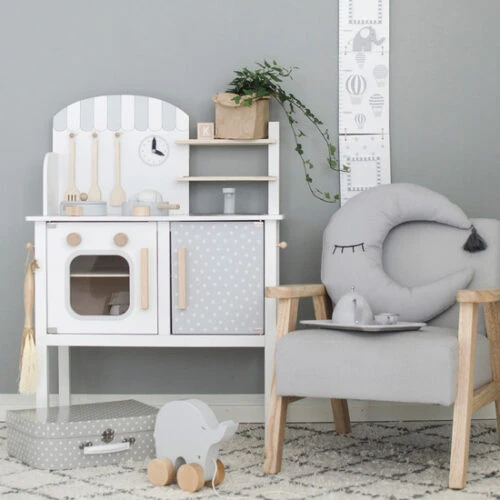 Für junge Hobbyköche eignet sich diese Spielzeug-Küche einfach perfekt: Sie bietet neben einem aufklappbaren Herd samt Backblech und einem Waschbecken aus Metall auch jede Menge Stauraum hinter den Schranktüren. Dazu kommen kleine Details wie eine Küchenuhr mit verstellbaren Zeigern sowie jede Menge Zubehör, darunter eine Pfanne, ein Topf und einige Kochlöffel.