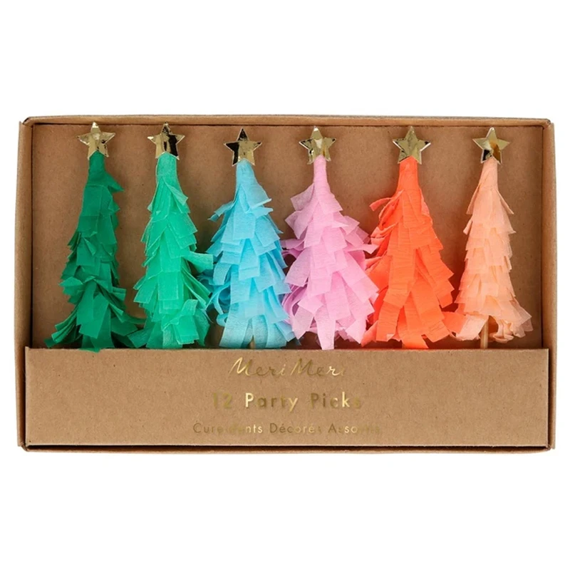 Mit dieser liebevollen Tisch-Verzierung von Meri Meri im Weihnachtsbaum-Design schmeckt das Essen gleich noch besser! Die Regenbogen-Optik der gefranzten Weihnachtsbäume verleiht der festlichen Dekoration einen gewissen Party-Pep. Die goldenen Sterne an der Spitze der Bäume stellen das Highlight der Spieße dar und bringen jeden Festtisch zum Funkeln.