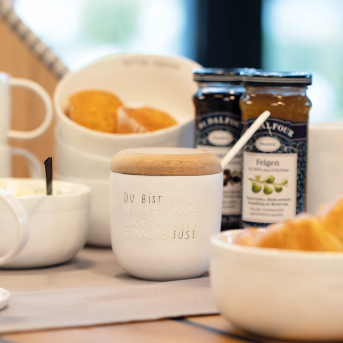Diese niedliche Zuckerdose ist dank ihres hochwertigen Designs ein feines Detail auf jedem Frühstückstisch. Insbesondere die Prägung auf dem Porzellan macht optisch einiges her. Ein ebenfalls aus Porzellan bestehender Löffel ist ebenfalls im Lieferumfang enthalten. Es entstammt der „Guten Morgen“-Kollektion des Traditionsherstellers räder.